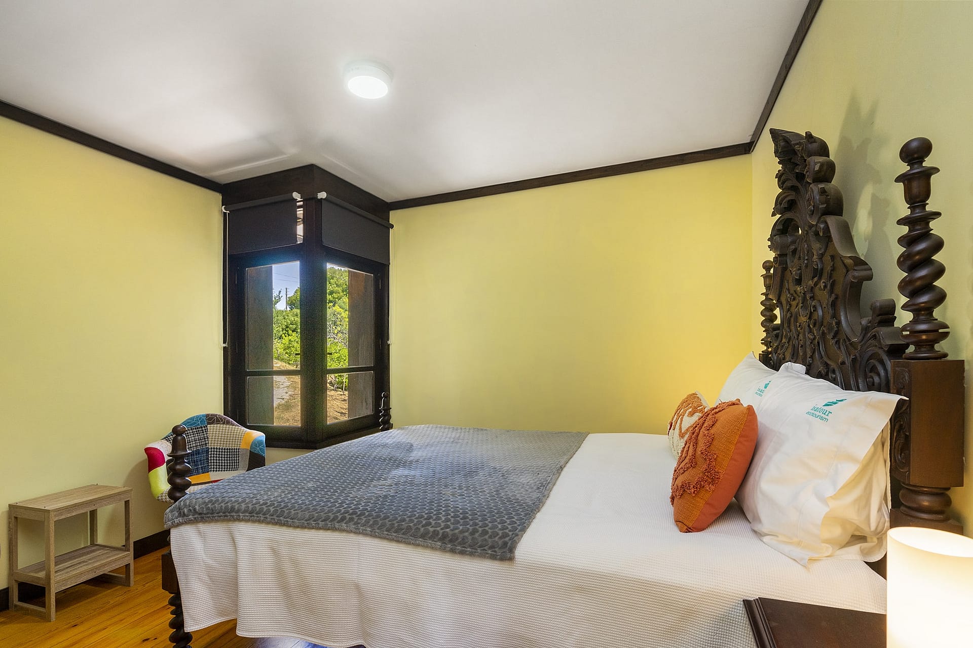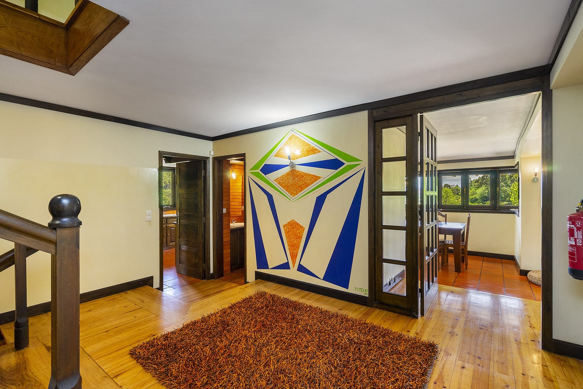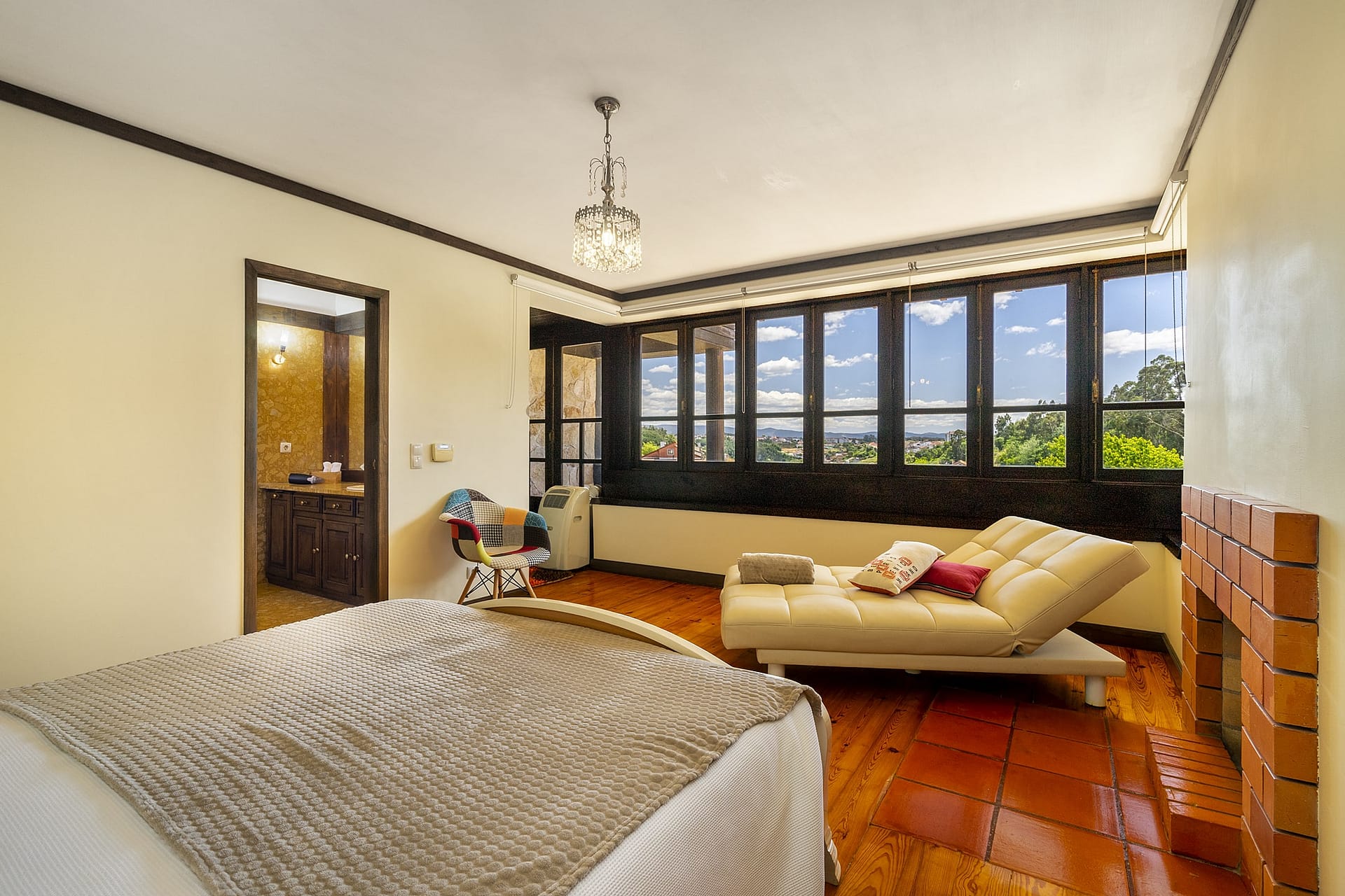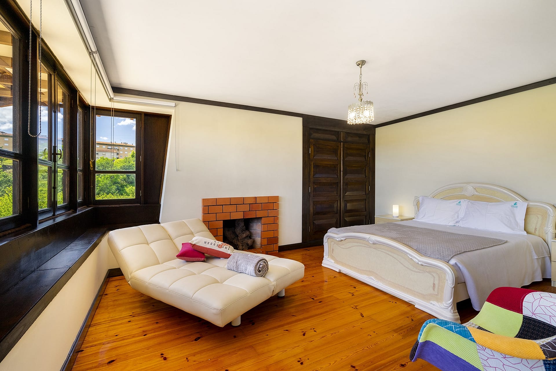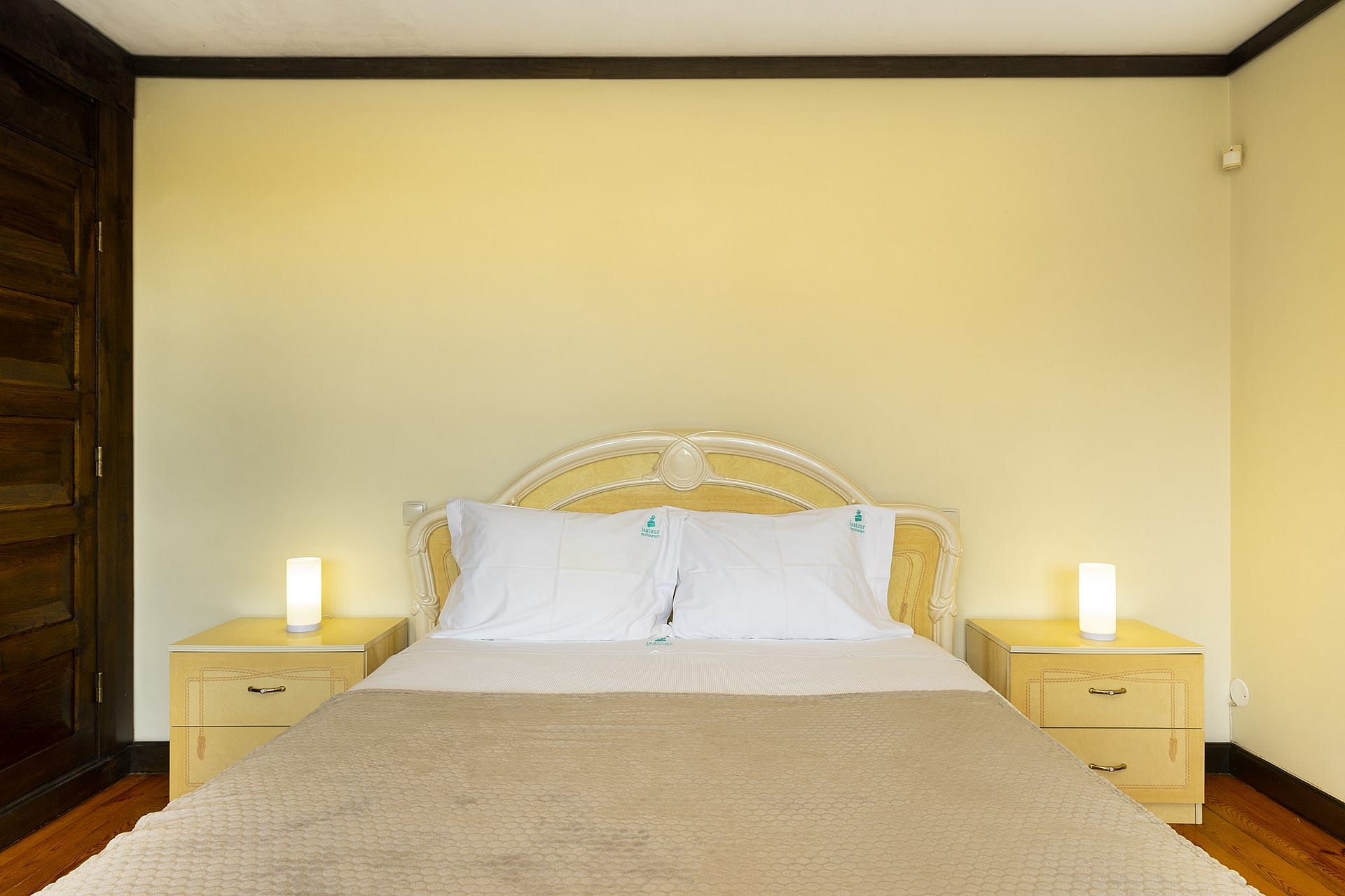 No piso 1 tem 2 quartos com camas de casal e um WC completo compartilhado entre os dois, uma suite com lareira, cama larga de casal, um sofá cama de 2 lugares, WC completo privativo e uma varanda (torreão).
