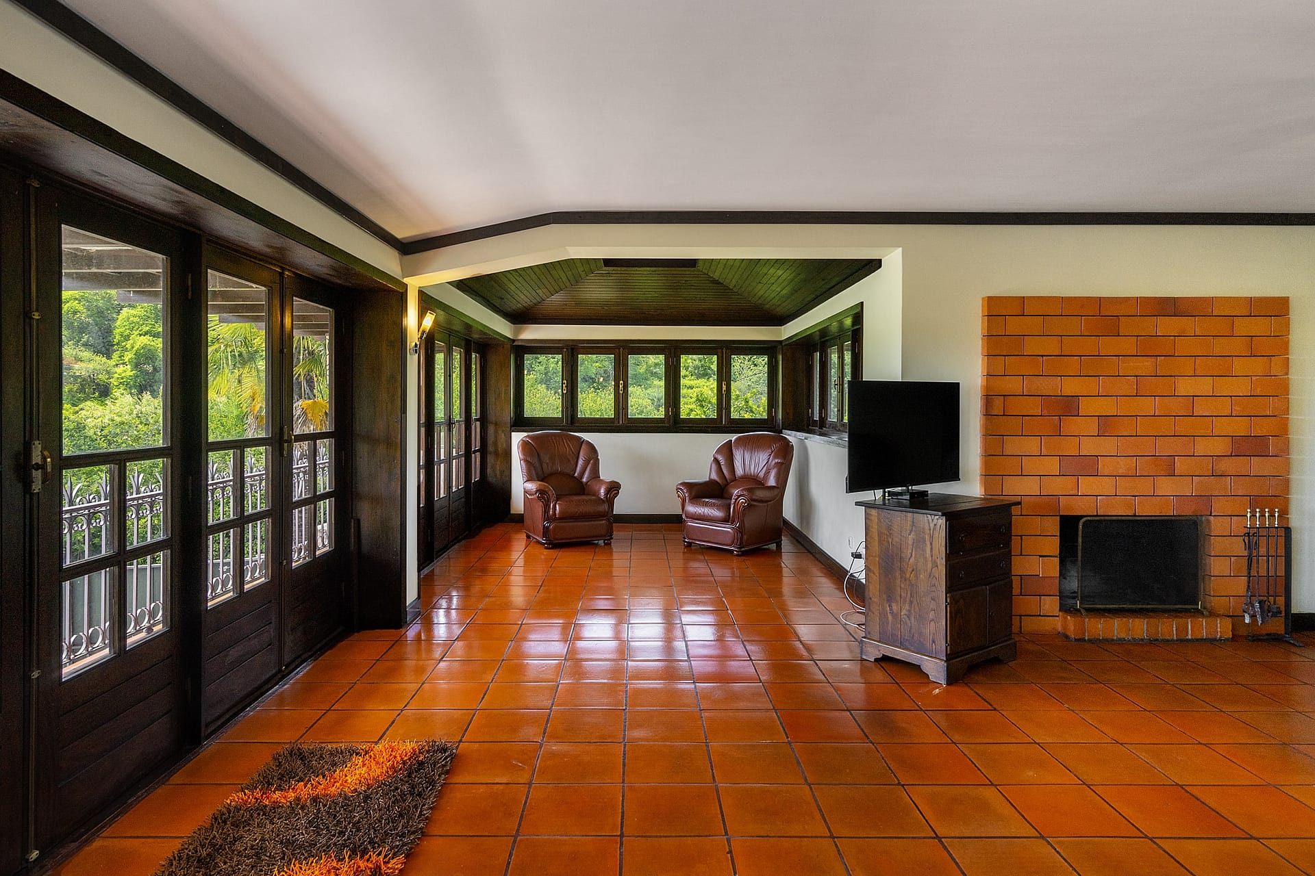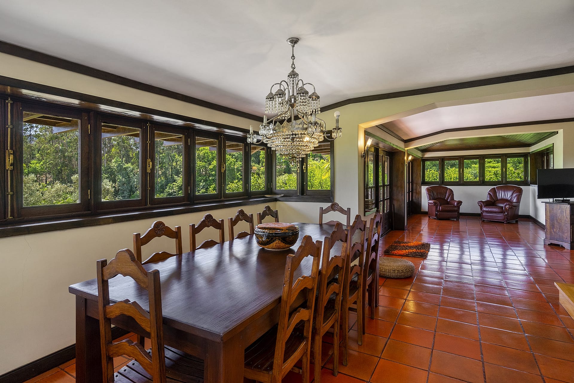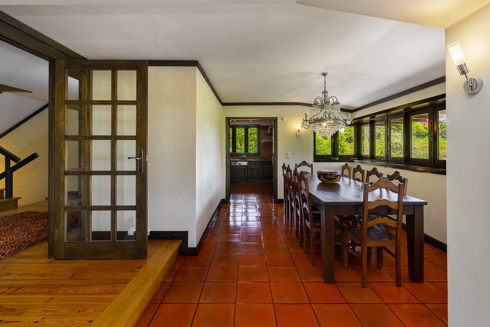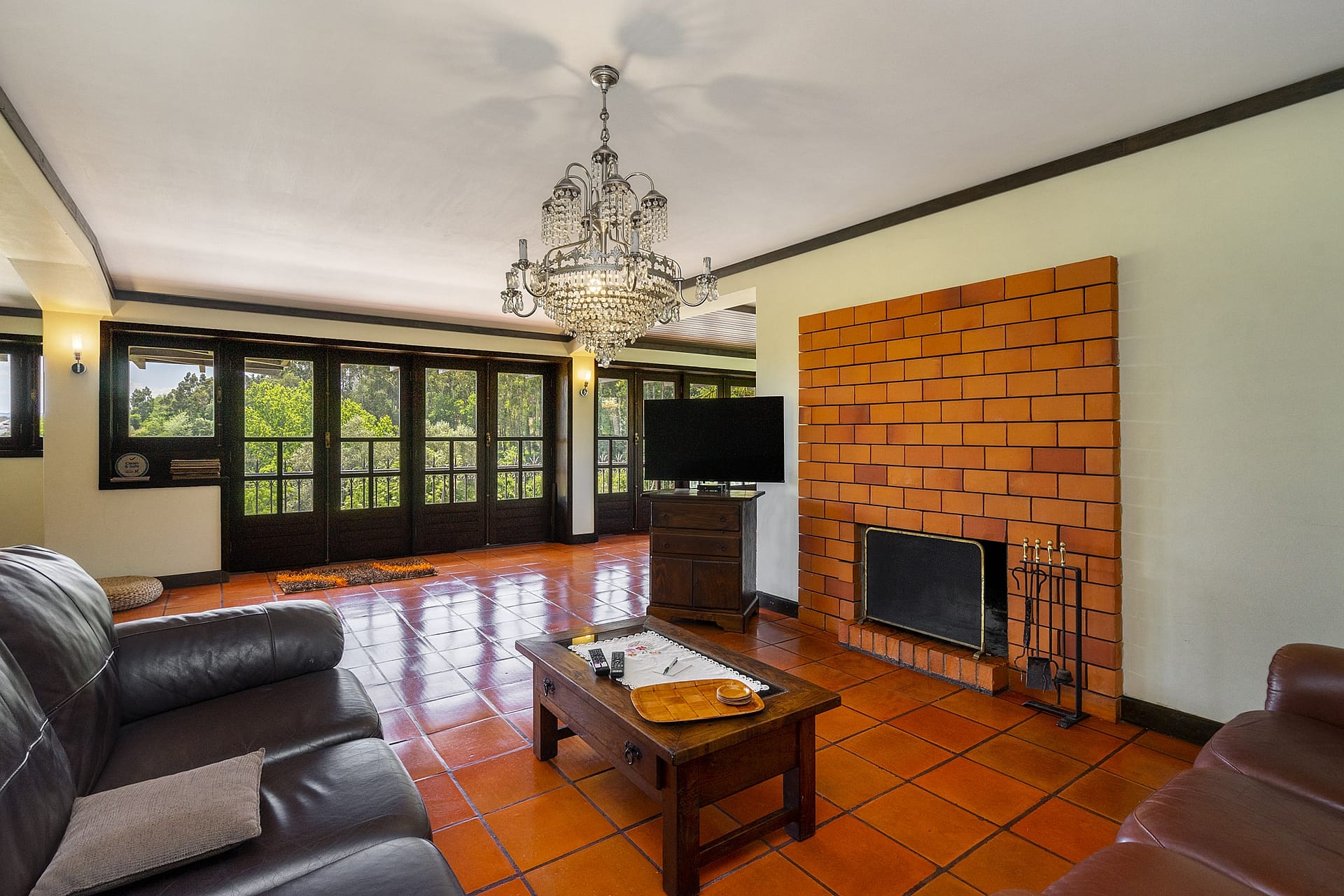 Tem salas de estar com lareira, sala de jantar, cozinha, WC de serviço e três varandas no piso do R/C, com muita luz natural e vistas sobre a cidade e o campo.